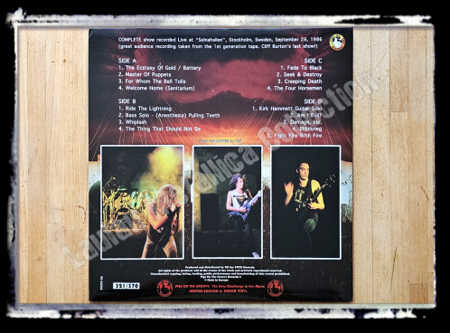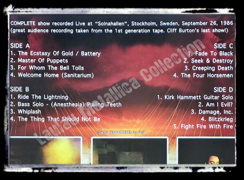 Comments : Great audience recording taken from the 1st generation tape. This is the last show of Cliff Burton.
