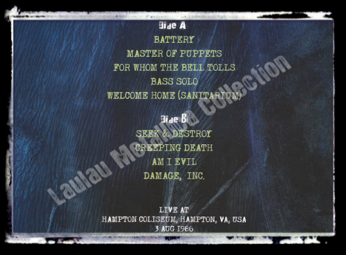 Track List : Side A : Battery, Master Of Puppets, For Whom The Bell Tolls, Bass Solo, Welcome Home (Sanitarium)